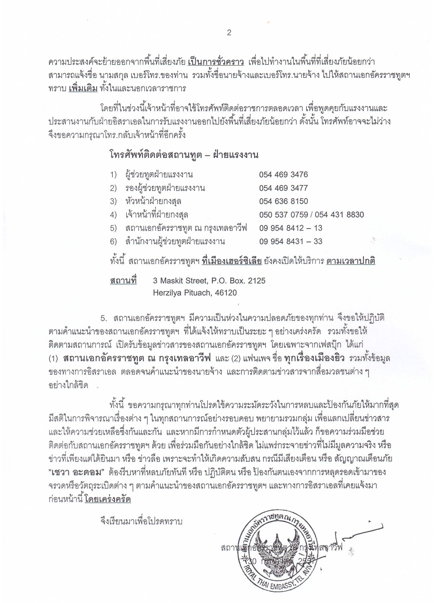 โดยที่ในช่วงนี้เจ้าหน้าที่อาจใช้โทรศัพท์ติดต่อราชการตลอดเวลา เพื่อพูดคุยกับแรงงานและประสานงานกับฝ่ายอิสราเอลในการรับแรงงานออกไปยังพื้นที่เสี่ยงภัยน้อยกว่า ดั้งนั้น โทรศัพท์อาจจะไม่ว่าง จึงขอความกรุณาโทร.กลับเจ้าหน้าที่อีกครั้ง