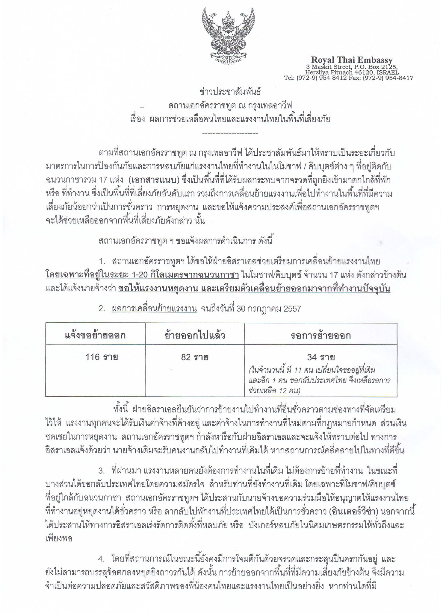 ผลการช่วยเหลือคนไทยและแรงงานไทยในพื้นที่เสี่ยงภัย ณ วันที่ 30 กรกฎาคม 2557