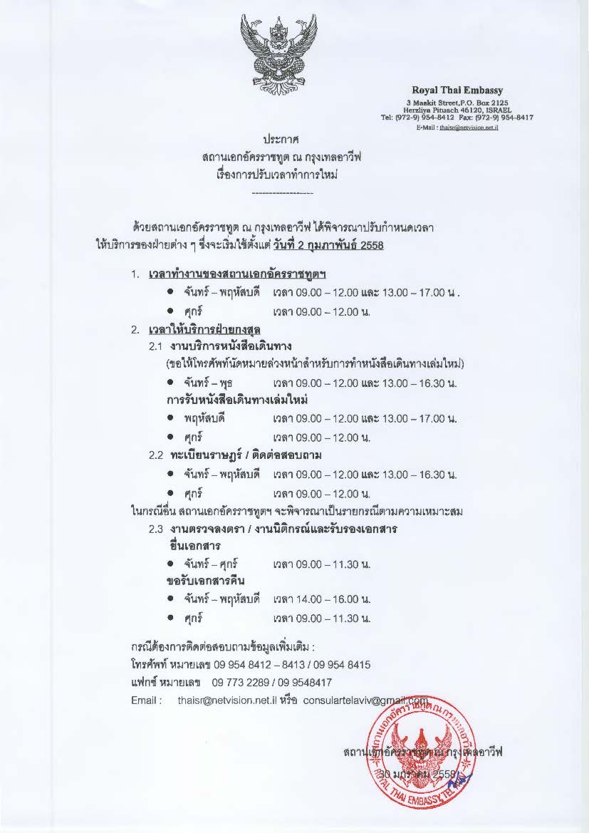 (972-9) 954-8412,954-8413 หมายเลขติดต่อฉุกเฉิน (นอกเวลาราชการ) สำหรับคนไทยขอความช่วยเหลือกรณีฉุกเฉินเท่านั้น 054-636-8150